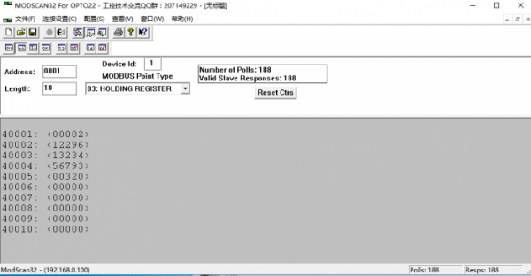我司RFID设备与PLC及测试工具连接上,很多用户还不是很清楚,特在此将测试界面及检测数据截图放置于此,可供参考。另说明,当寄存器40001处于0状态是,读卡器不读卡;当寄存器40001处于1状态时读卡器开始读卡,读到数据将存在寄存器4002-4010,此时40001状态改成2,此时停止读卡;如果未读到卡,40001状态改成3;更多>>